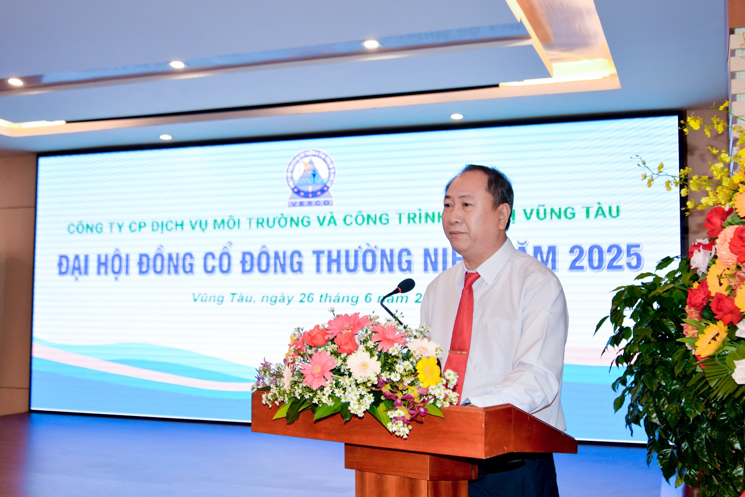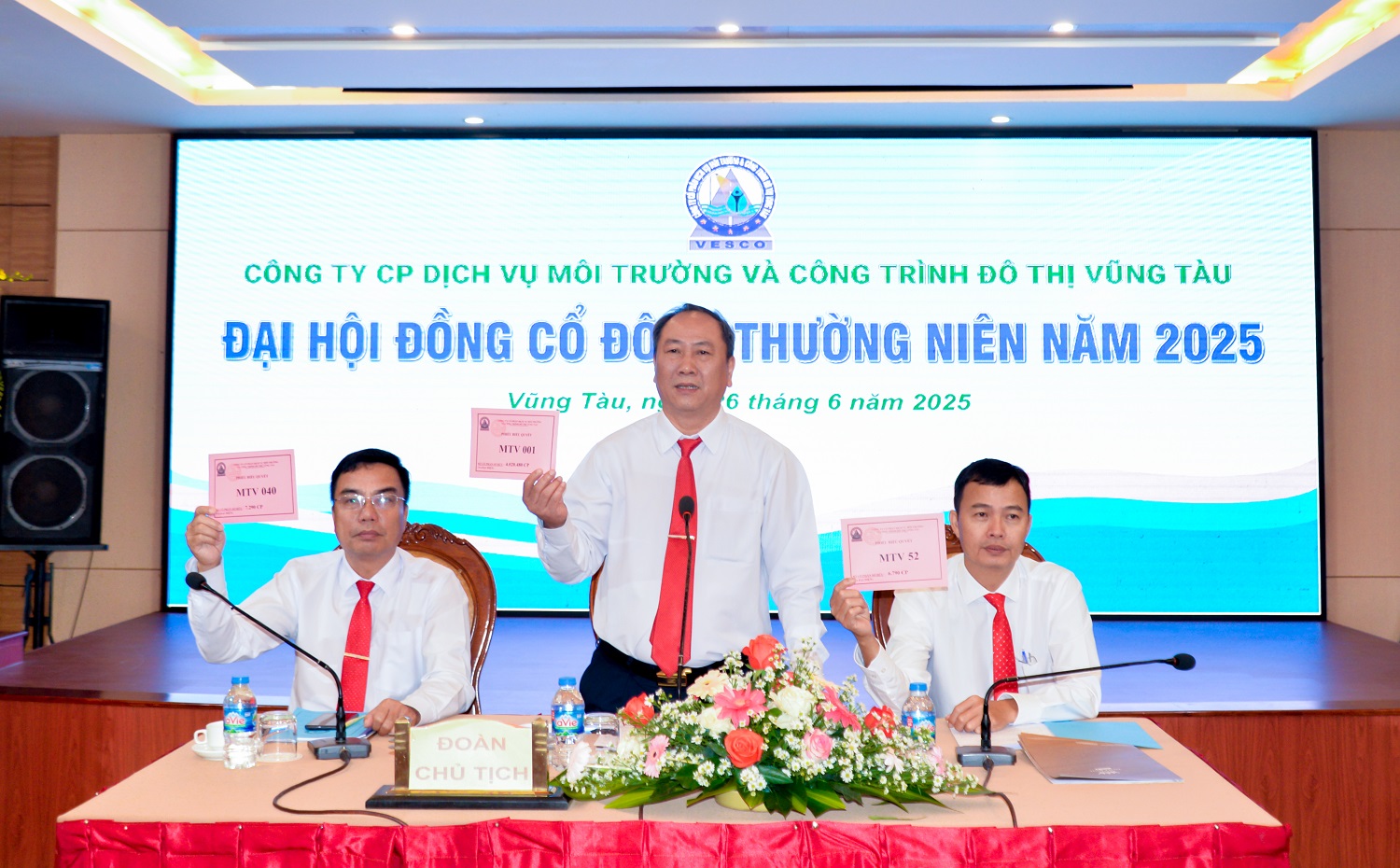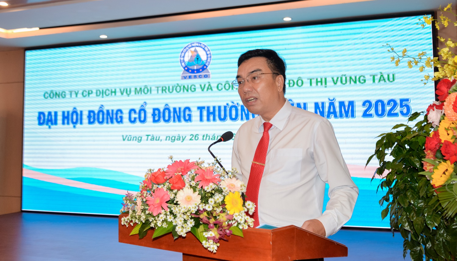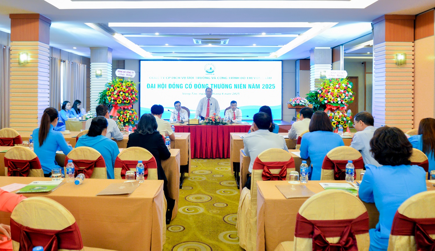 Sáng ngày 26/6/2025, tại hội trường khách sạn Palace thành phố Vũng Tàu, Công ty cổ phần Dịch vụ Môi trường và Công trình Đô Thị Vũng Tàu (VESCO) đã tổ chức Đại hội đồng cổ đông thường niên năm 2025. Đến tham dự đại hội có sự hiện diện của ông Nguyễn Xuân Mạnh, chủ tịch HĐQT, Ông Phan Xuân Huân - Tổng Giám đốc công ty, Ông Nguyễn Xuân Hậu – Phó Tổng Giám đốc công ty, Ông Đinh Ngọc Tuấn, Kế toán trưởng Công ty, các thành viên trong Ban kiểm soát cùng sự có mặt của 39 cổ đông, tương đương hơn 90% tổng số cổ phần có quyền biểu quyết tham dự đại hội.